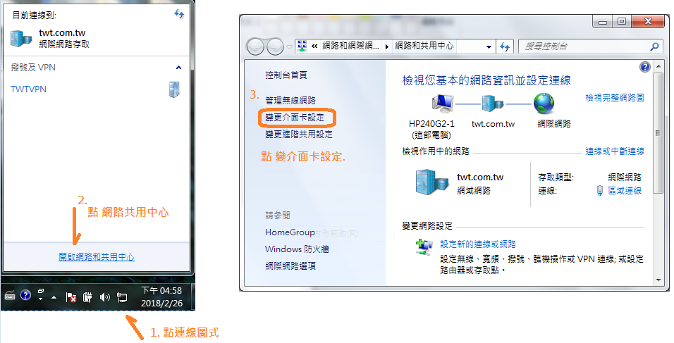 2. 確定 網路連線是否成功 : 可以檢查電腦右下角連線的圖示, 與檢查數據機 " LAN" 孔是否亮燈.