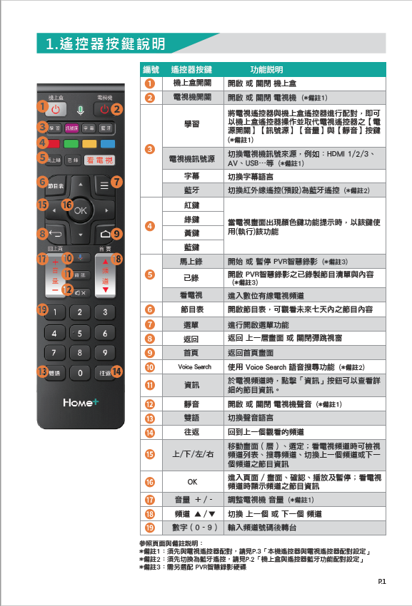 遙控器按鍵說明